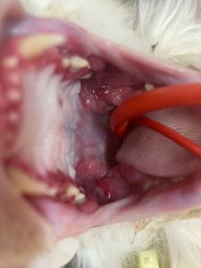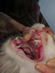 Wie zu erwarten war, mussten sämtliche Zähne operativ entfernt werden, da der gesamte Zahnhalteapparat schwer geschädigt war (ausgeprägte Paradontitis).