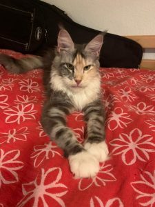 Am 20.09.2020 kam Karma in die Obhut der Maine Coon Hilfe e.V. Da wir im Vorfeld schon wussten, dass die Maulhöhle der 1 ½-jährigen Katze extrem entzündet war, hatten wir für den darauffolgenden Tag einen OP-Termin bei einer Spezialistin vereinbart. Dass dieser Termin so dringend war wie gedacht, wurde bei der Ankunft deutlich. Karmas Gesicht war extrem geschwollen, und sie stank fürchterlich aus dem Maul. Mit 4,1 kg war Karma deutlich untergewichtig, und wie bei nahezu allen Katzen mit Maulproblemen wirkte ihr Fell strähnig und struppig.
