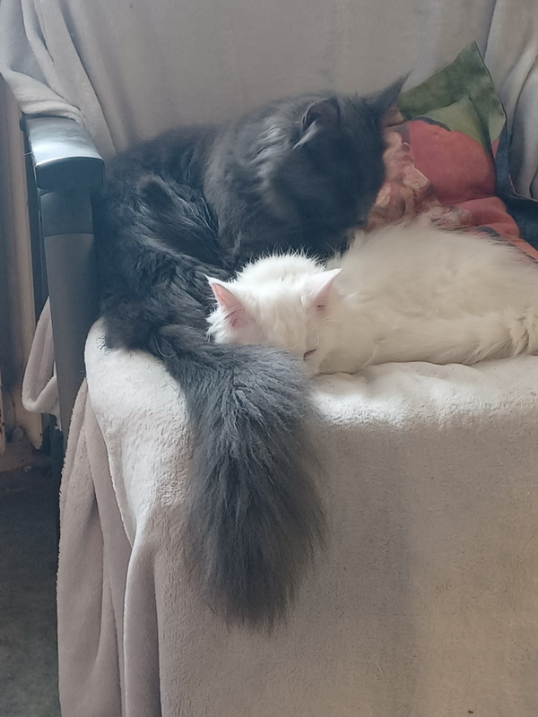 Die beiden sind richtig dick miteinander – spielen, raufen, prügeln, putzen, kuscheln. Wahrscheinlich weil beide ähnlich grobmotorisch veranlagt sind. Auch Nami hat hier wenig Freunde, ist „geduldet“. Wenn die beiden zusammen ein Zuhause finden würden, das wäre wirklich klasse. Allerdings sind beide nur bedingt Kuschelkatzen.