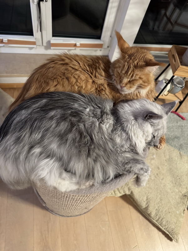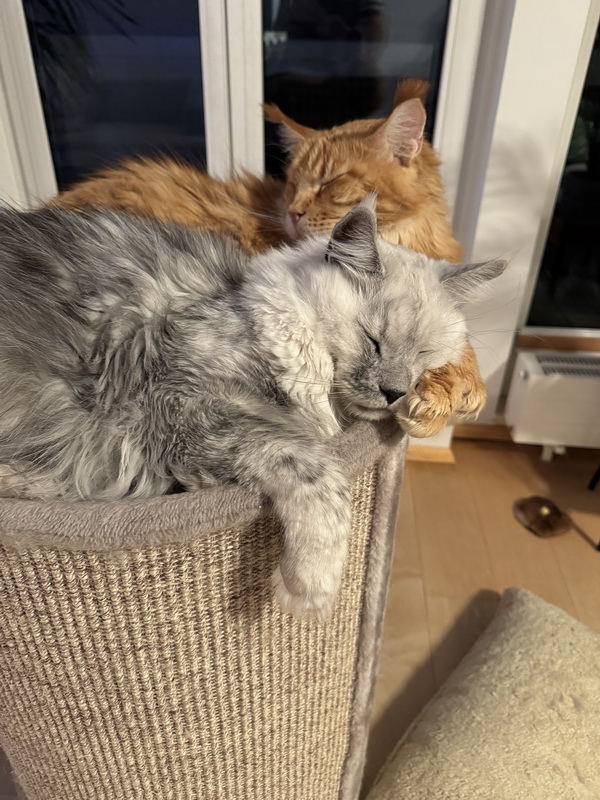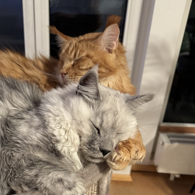 - Soziales: Beide Kater sind ein eingespieltes Team (gegenseitiges Putzen, Schmusen, Toben).